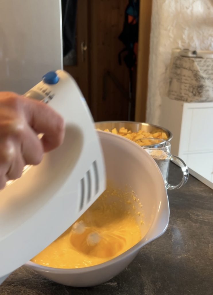 Zucker, Eier und Mehl in eine Schüssel geben und schaumig rühren. Nun das Mehl nach und nach, sowie die Milch und das Zitronenkonzentrat zur Zucker- Ei-Buttermasse geben und zu einem glatten Teig verrühren. Anschließend die Apfelwürfel zufügen und unterheben.