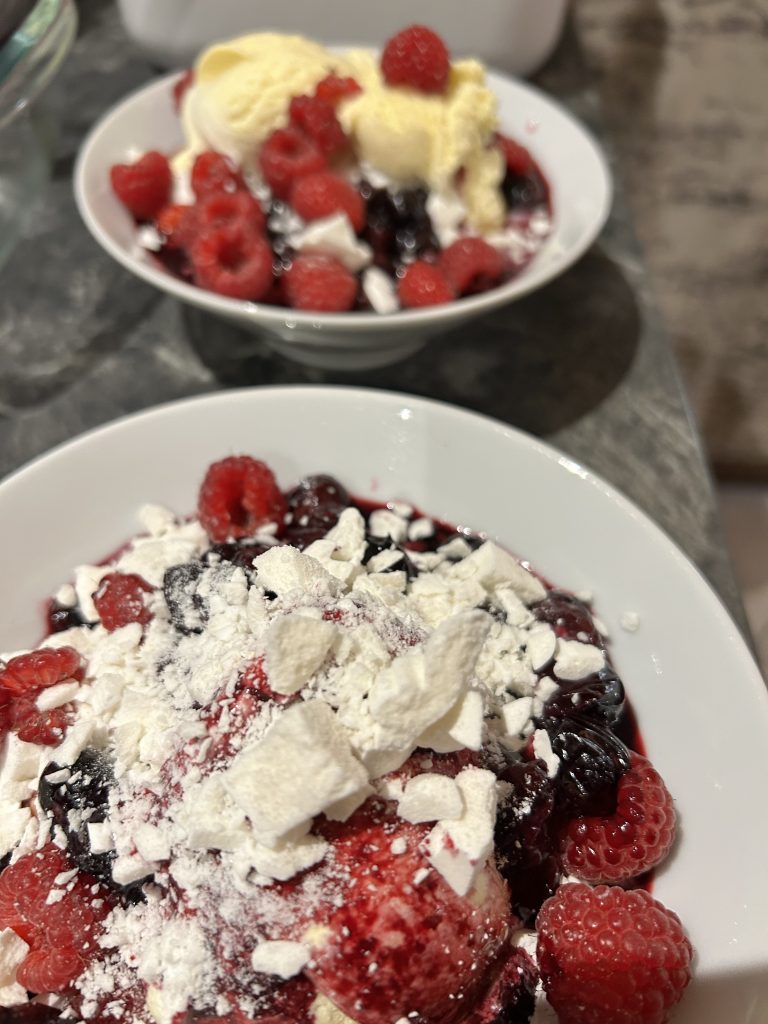 Die Blaubeeren mit etwas Wasser in einer beschichteten Pfanne bei hoher Hitze etwa 2 Minuten erhitzen, bis sie aufplatzen. Das Eis aus dem Gefrierschrank nehmen. Die Himbeeren halbieren und das Baiser grob zerbröseln.