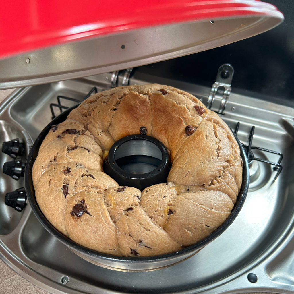 Der Zopf gelingt in jedem Ofen. Im Herd zuhause backe ich ihn bei 180° für 20-30 Min.