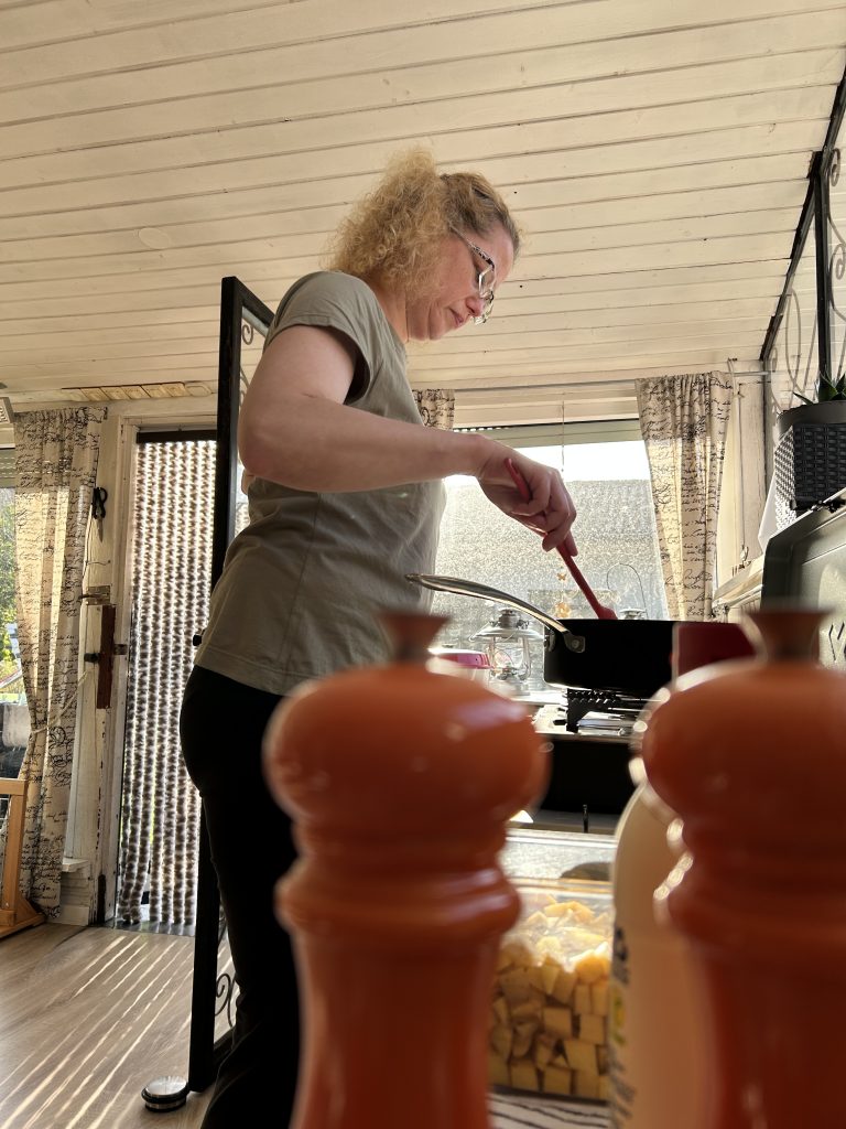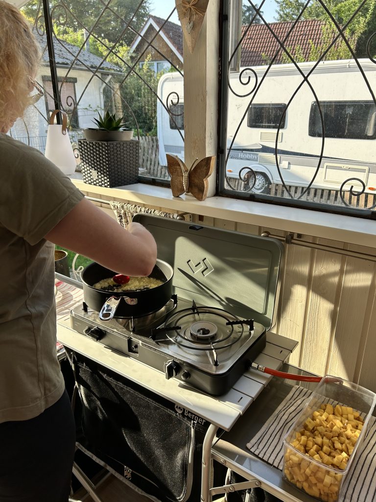 Zuerst habe ich die Zwiebeln zusammen mit dem Knoblauch und dem Hähnchen in Olivenöl angebraten (auf dem Gasherd hat sich die Tefal Schmorpfanne bewährt) . Nach etwa 5 Minuten kommen die Kartoffeln dazu, und nach weiteren 10 Minuten füge ich den Porree sowie den Thunfisch hinzu. Das Gericht wird anschließend weitere rund 15 Minuten fertig gegart. Zwischendurch sollte es regelmäßig gewendet werden, damit nichts anbrennt. (Ich verwende gerne den 2 Cook 3 PRO von Cadac, um das Campingfeeling auch zuhause aufrechtzuerhalten.)