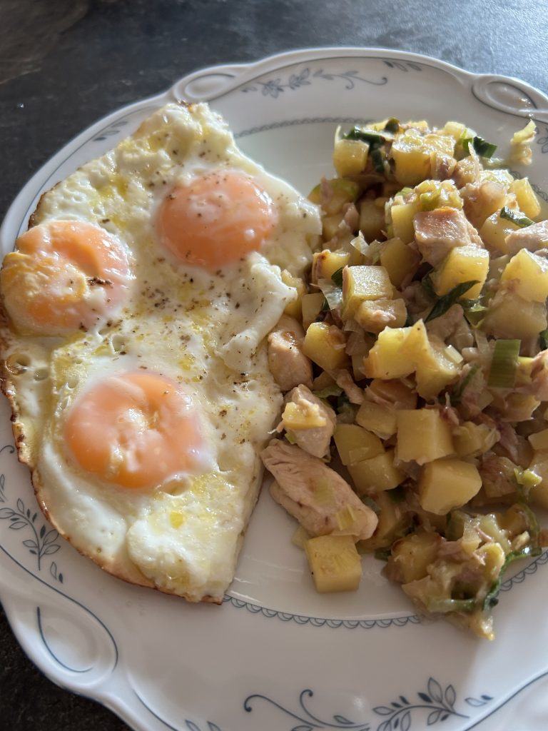 Zum Ende der Garzeit bereite ich auf dem zweiten Brenner die Spiegeleier zu. Diese werden anschließend zusammen mit der Kartoffelpfanne auf einem Teller angerichtet.