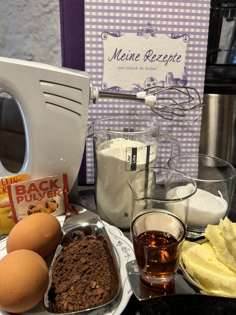 Mehl mit Backpulver vermengen und zusammen mit 50 ml Milch und Rum zur Buttermasse geben und gut verrühren.