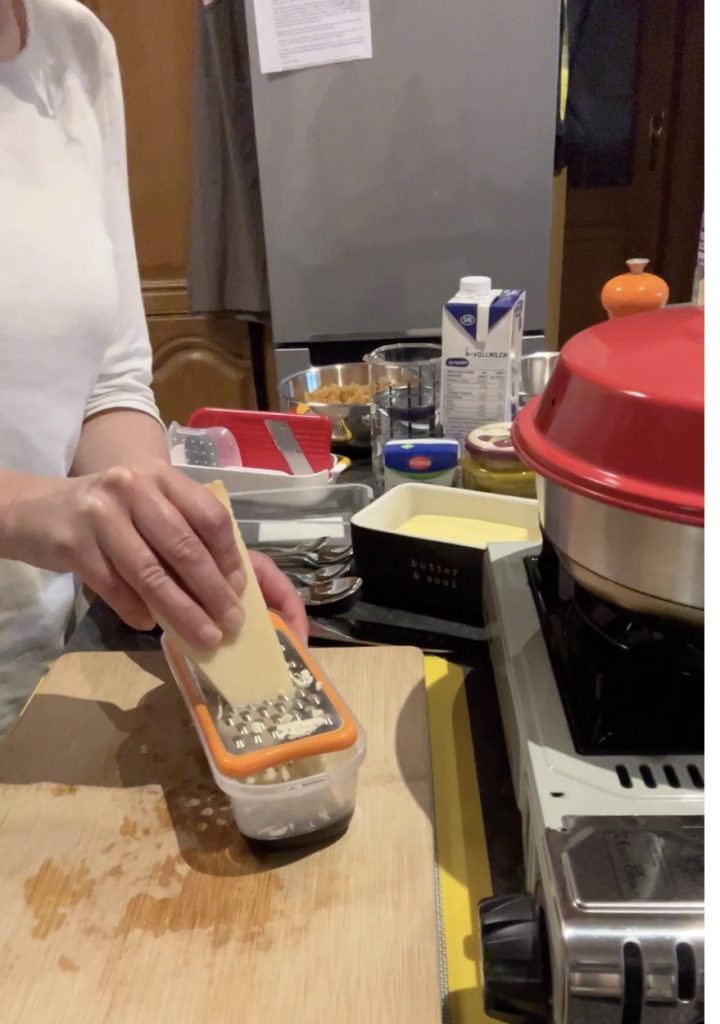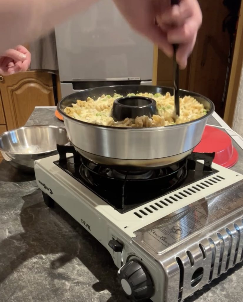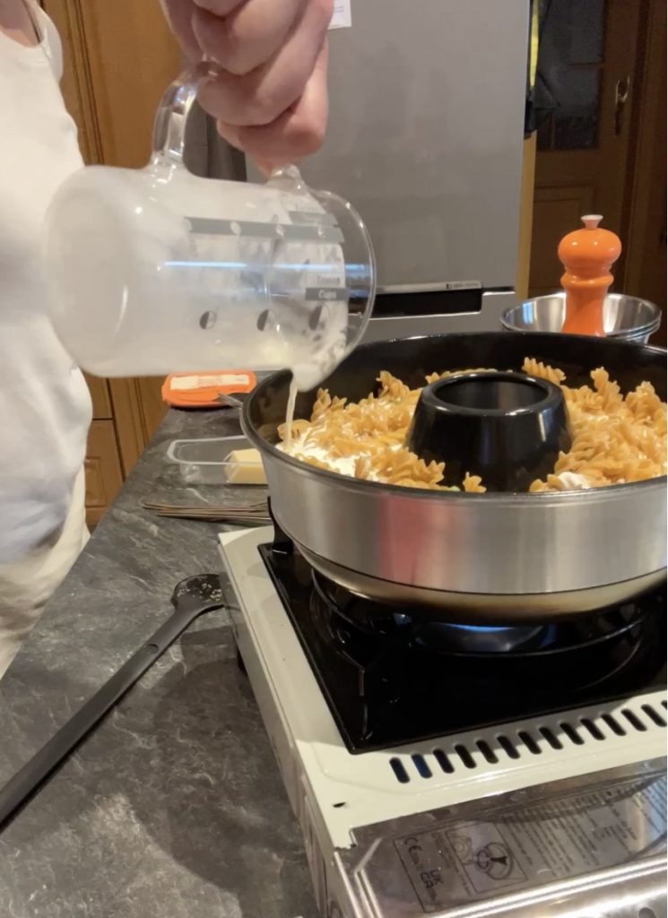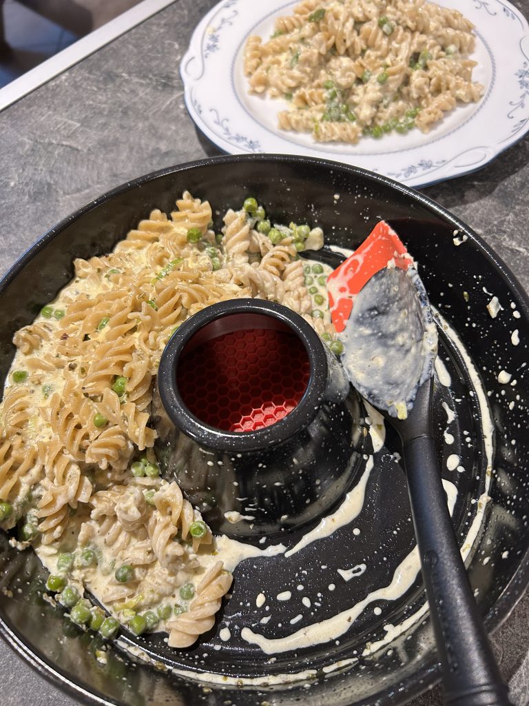 Nudeln abwiegen. Frühlingszwiebeln in Ringe schneiden. Knoblauch und Zwiebel schälen und fein hacken. Den Käse reiben und die Erbsen abwiegen. Butter in einem Topf schmelzen. Zwiebeln, Knoblauch und Frühlingszwiebeln darin 2 Minuten andünsten. Erbsen und Gewürze hinzufügen und kurz mitdünsten. Milch und Sahne vermischen, Brühe anrühren und zum Gemüse geben. Alles 5 Minuten köcheln lassen. Die Nudeln hinzufügen, mit der Milch-Sahne-Mischung und Brühe auffüllen, mit den restlichen Gewürzen abschmecken und gut umrühren. Die Mischung 20 Minuten bei mittlerer Hitze garen. Herd ausschalten und den geriebenen Käse unterrühren. Das Ei in einer Schüssel verquirlen, über die Nudeln geben und gründlich unterheben.